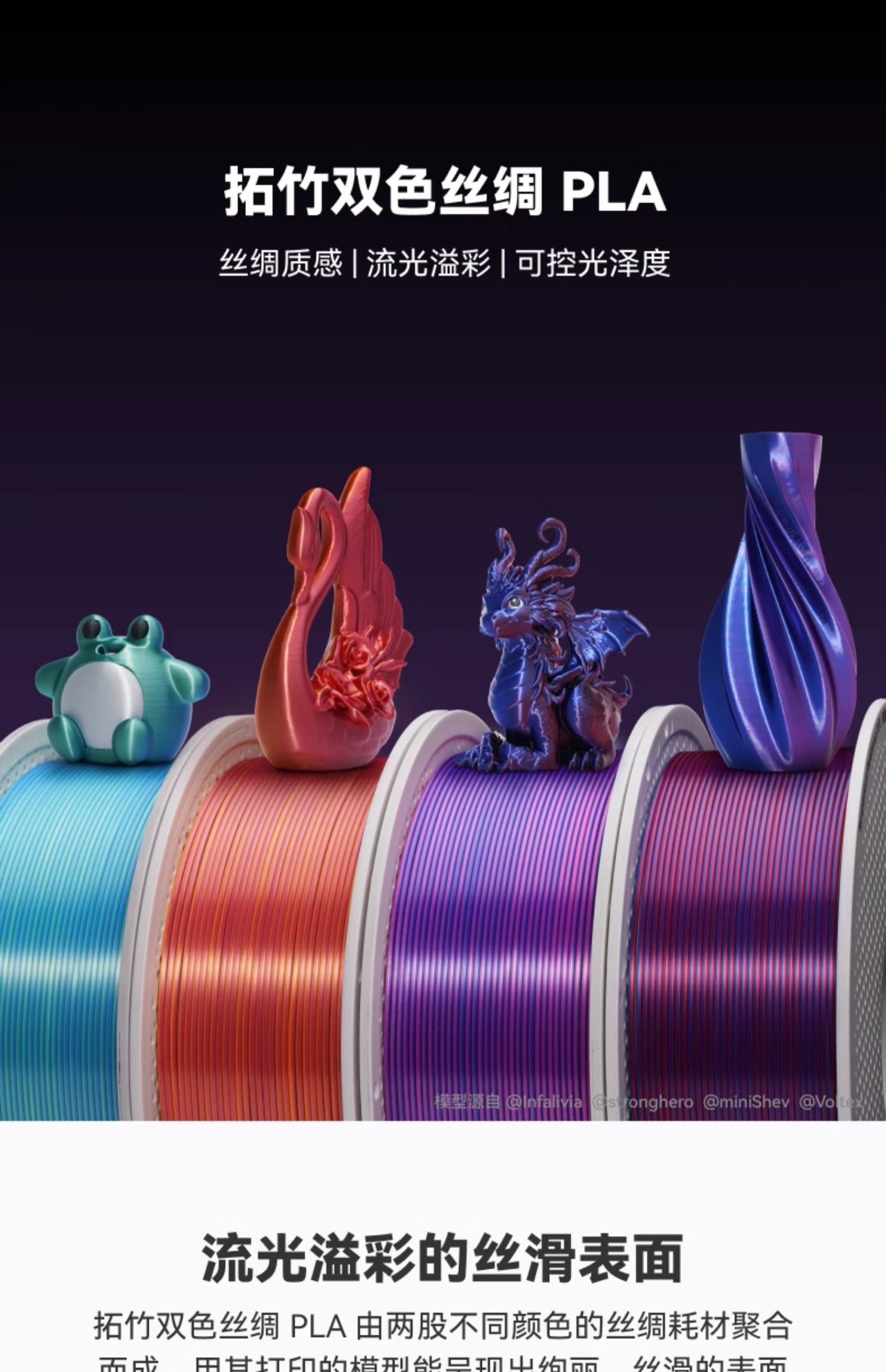 无论是制作精致的装饰品,还是创作独一无二的艺术品,拓竹双色丝绸 PLA 都能为你的作品注入闪耀的光芒和绚烂的色彩,是你打造独特 3D 打印模型的不二之选。